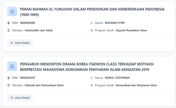 Setelah menekan tombol “Cari”, Sibasis akan menampilkan daftar skripsi yang sesuai dengan kriteria pencarianmu. Baca sekilas judul-judulnya, dan kalau ada yang menarik perhatian, langsung klik judul tersebut atau tombol “Lihat Detail”.