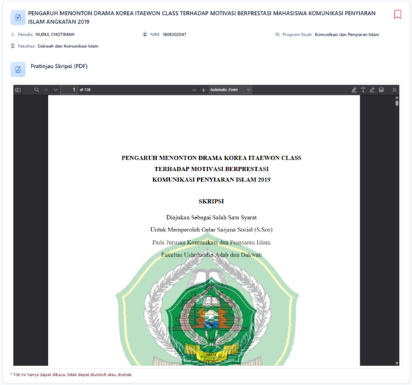 Setelah diklik, kamu akan masuk ke halaman baca. Di sini, kamu bisa membaca abstrak, daftar isi, bahkan (jika tersedia) keseluruhan isi skripsi. Manfaatkan fitur zoom untuk memperbesar teks agar lebih nyaman dibaca.